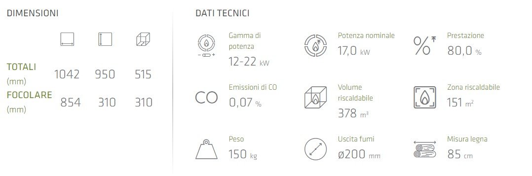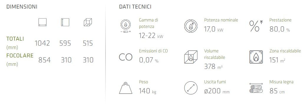 < Stufa frontale in acciaio < Versione con porta legna o sospeso a parete "Mural" < Stufa ventilata (ventilatore centrifugo) < Nuovo potenziometro di serie: 5 velocità, Man/Auto. e On/Off < Interno in vermiculite < ...