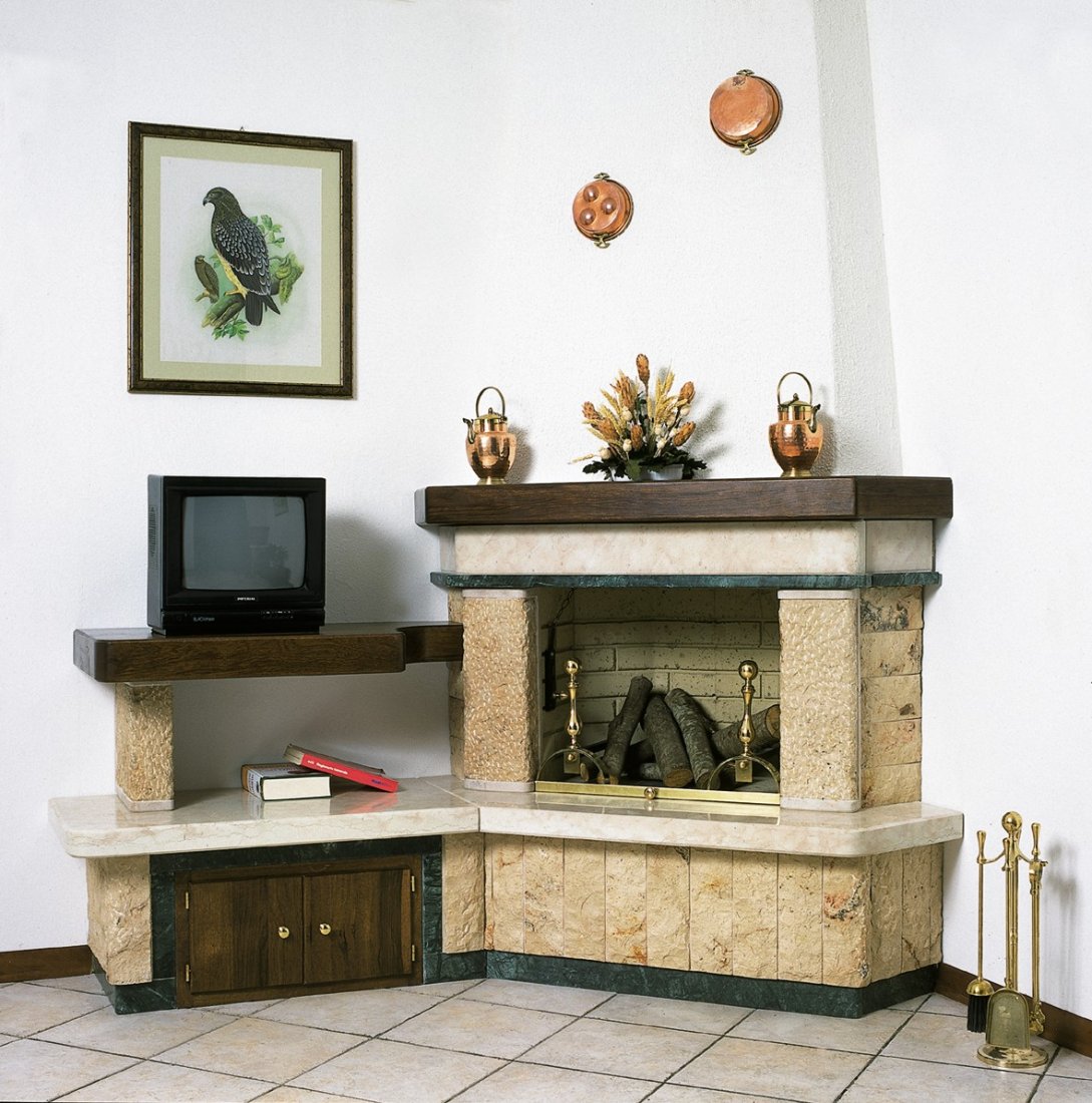 Caminetto con rivestimento realizzato in massetto di travertino rosato bugnato a bozzette con mensola piano fuoco dello stesso materiale; la versione moderna viene realizzata in massetto di trani bocciardato con mensole piano fuoco in rosso verona. ...