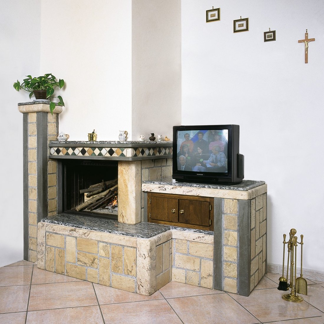 Caminetto con rivestimento realizzato in bozzette di travertino rosa, massetti di trani bocciardato, mensola piano fuoco in rosso verona; sportellini porta legna, porta TV e trave in legno massello tinta color noce.Versione: angolo o parete, destra ...