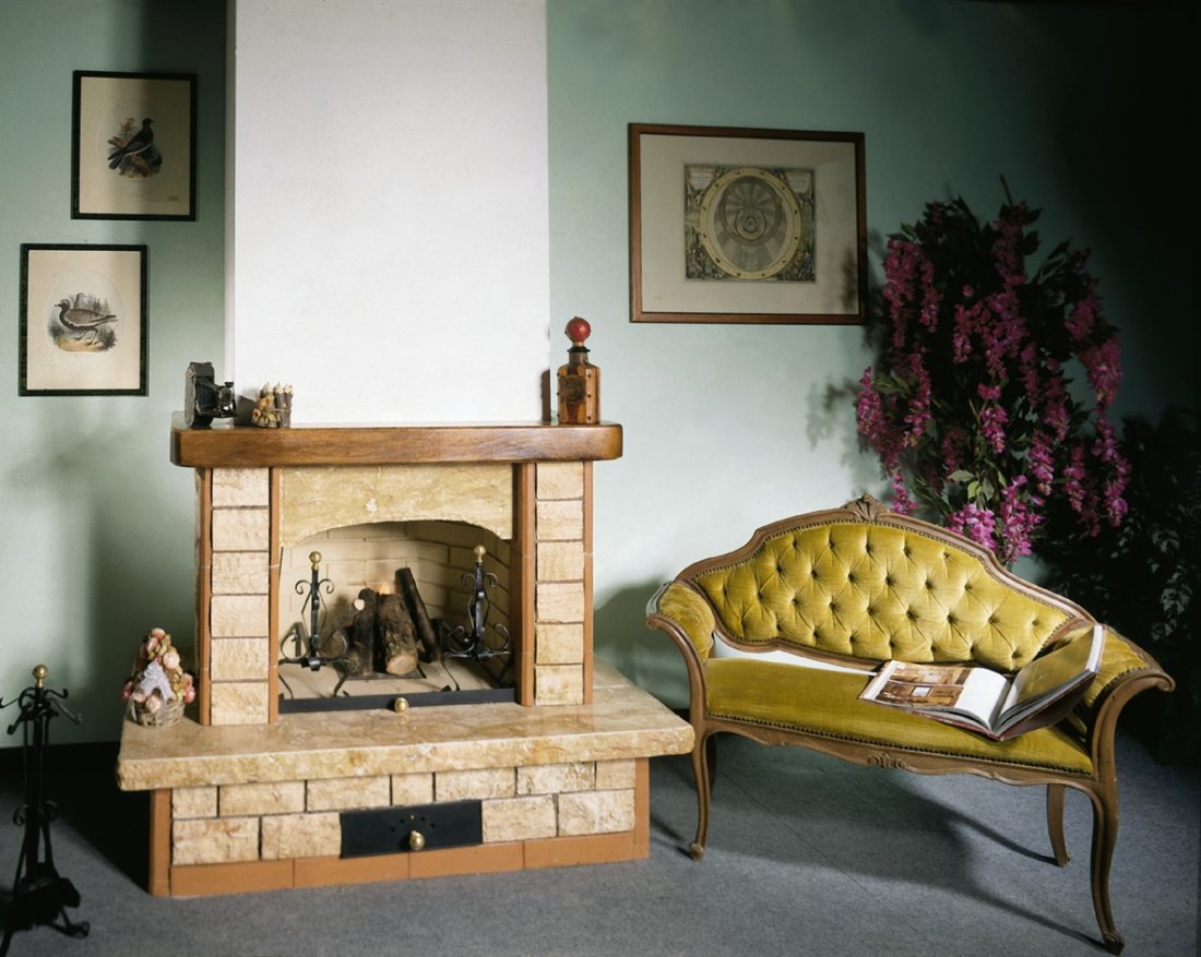 Caminetto con rivestimento realizzato con bozzette di travertino rosa e klincher murati a getto; lastre piano fuoco e frontalino in travertino rosa bugnato in costa; trave in legno massello tinta color noce.