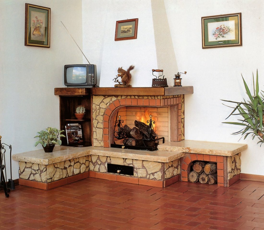 Caminetto con rivestimento realizzato in pezzi di pietra dorata murata a mosaico con rifiniture in cotto; mensole piano fuoco in travertino rosato, bugnato in costa; mobiletto porta oggetti e trave con porta televisore in massello di legno tinta color noce; si può avere anche nella versione con quarzo (es. art. 531), con bozzette bugnate di travertino rosato (es. art. 541), senza rifiniture in cotto, o con pietre, murate a mosaico, di travertino rosato o pietra dorata con cemento chiaro.