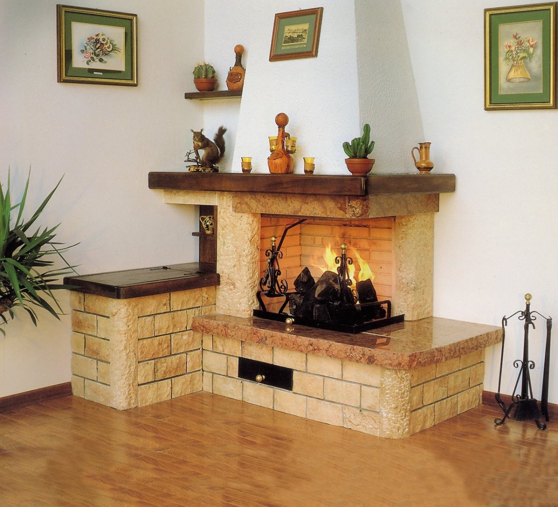 Caminetto con rivestimento realizzato in massetto e bozzette bugnate di travertino rosato con mensole piano fuoco ed architrave in rosso verona bugnato in costa; trave, cassapanca portalegna e mobiletto porta oggetti in massello di legno tinta color noce.