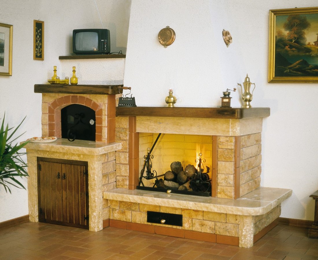 Caminetto con forno realizzato in bozzette bugnate di travertino rosato e rifinito in cotto; mensole piano fuoco sempre in travertino rosa con coste bugnate; trave, sportello porta legna e mensola porta televisore in massello di legno tinta color noce; a richiesta si può avere con pietre di travertino rosa o di pietra dorata murata a mosaico (vedi art. 528); inoltre, sempre a richiesta, viene realizzato in quarzo bianco lavorato a buccia d’arancio e rifiniture in cotto (vedi art. 531).