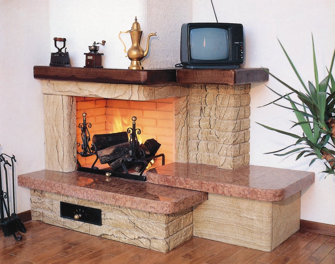 Caminetto con rivestimento realizzato in massetto di pietra dorata bugnata a bozzette e bocciardata; mensole piano fuoco in rosso verona e trave con porta televisore in massello di legno tinta color noce; a richiesta si può avere nella versione moderna sostituendo la pietra dorata con trani bocciardato.