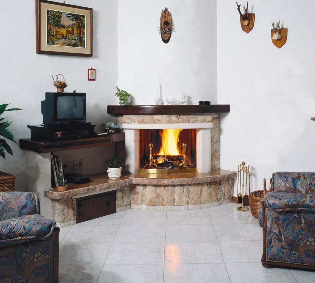 Caminetto con rivestimento realizzato in bozzette di travertino rosa, massetti di trani bocciardato, mensola piano fuoco in rosso verona; sportellini porta legna, porta TV e trave in legno massello tinta color noce.