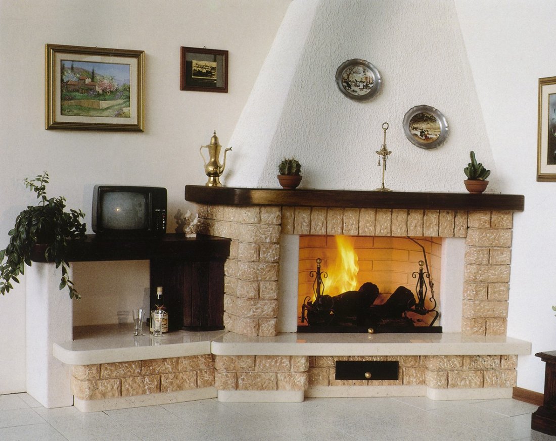 Caminetto con forno realizzato in bozzette bugnate di travertino rosato e rifinito in cotto; mensole piano fuoco sempre in travertino rosa con coste bugnate; trave, sportello porta legna e mensola porta televisore in massello di legno tinta color ...