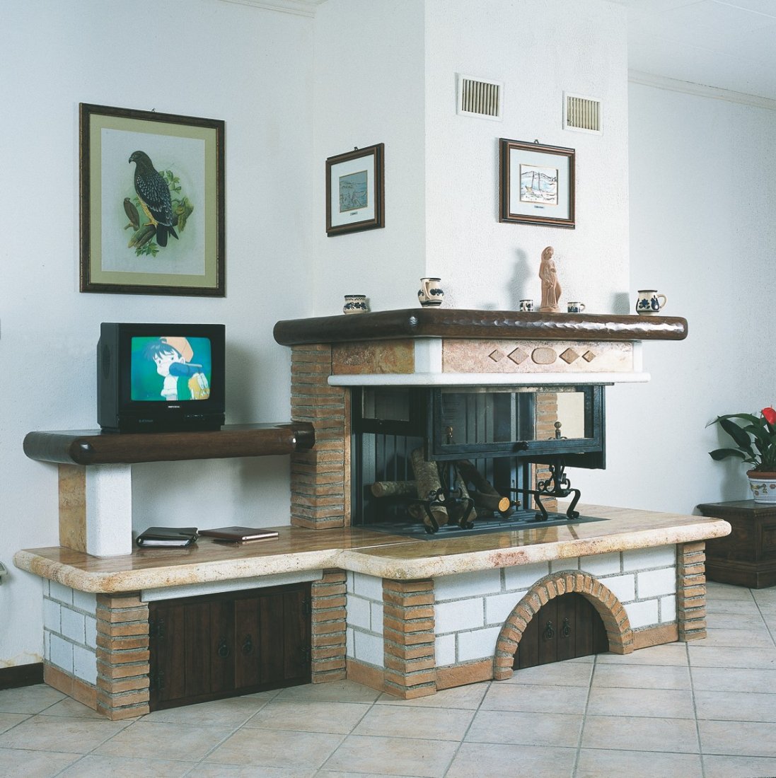 Caminetto con rivestimento in bozzette sabbiate di travertino rosato, mensole, piano fuoco ed architrave di rosso Verona anticato, mensole, sportello, mobiletto e cassapanca in legno massello tinta color noce. A richiesta può essere realizzato ...