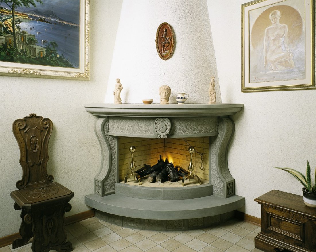 Caminetto con rivestimento realizzato in pietra serena completamente scolpito a mano.