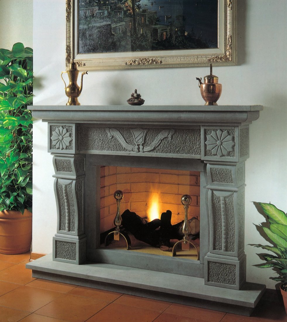 Caminetto con rivestimento realizzato in massetto di pietra serena completamente scolpito a mano.
