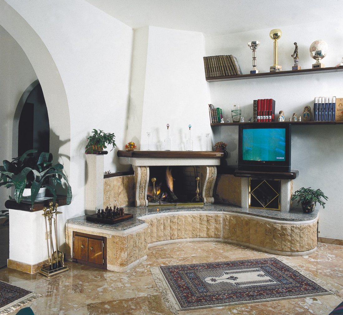Caminetto con rivestimento realizzato in massetto di trani bocciardato con rifiniture lucidate; sportello del mobile bar in ottone trattato; mensole e sportello del porta legna in massello di legno tinta color noce; mensole piano fuoco e piano panca ...