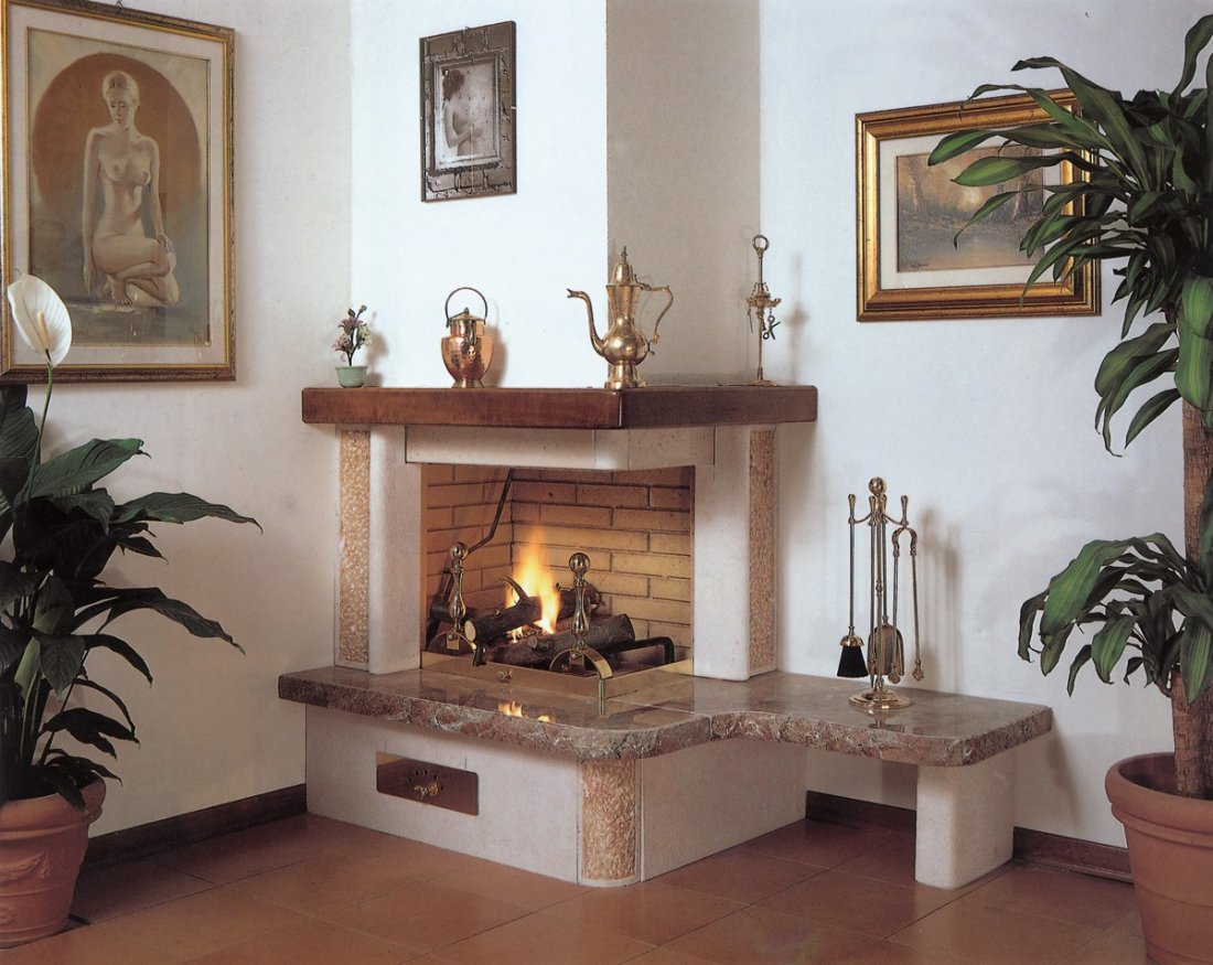 Caminetto con rivestimento realizzato in massetto di trani bocciardato e rifiniture in travertino rosa bugnato con nastrini; mensole piano fuoco in rosso marocco con costa bugnata; trave in legno massello tinta color noce. Il piano fuoco può essere sostituito con marmi e graniti diversi; ed il caminetto può essere realizzato su misure del cliente.