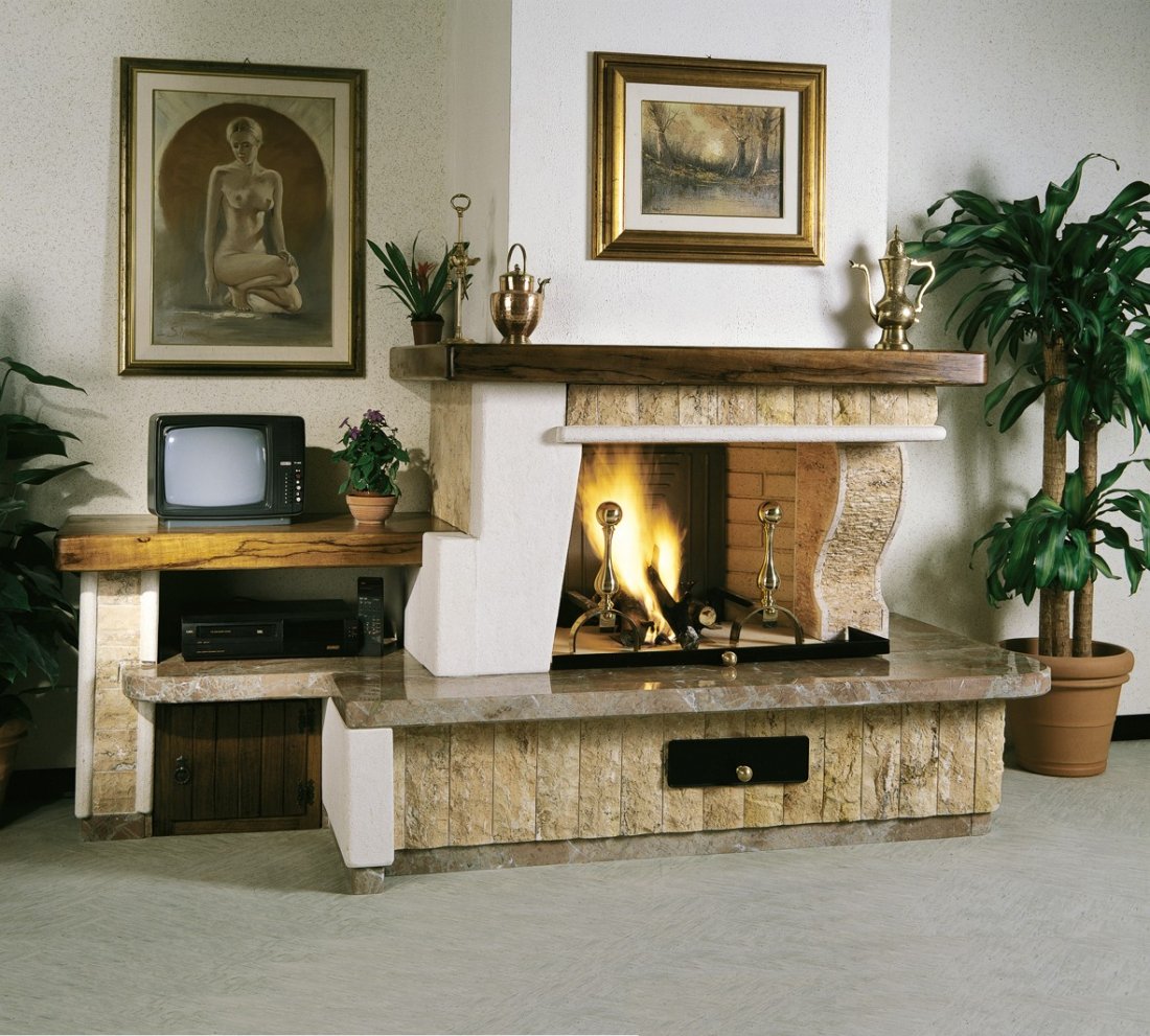 Caminetto con rivestimento realizzato in massetto di travertino rosa con rifiniture in massetto di trani bocciardato; battiscopa e mensole piano fuoco in rosso marocco lucidato; sportello porta legna, porta TV e trave in legno massello tinta color noce. Può essere realizzato su misure fornite dal cliente e con marmi e graniti diversi.
