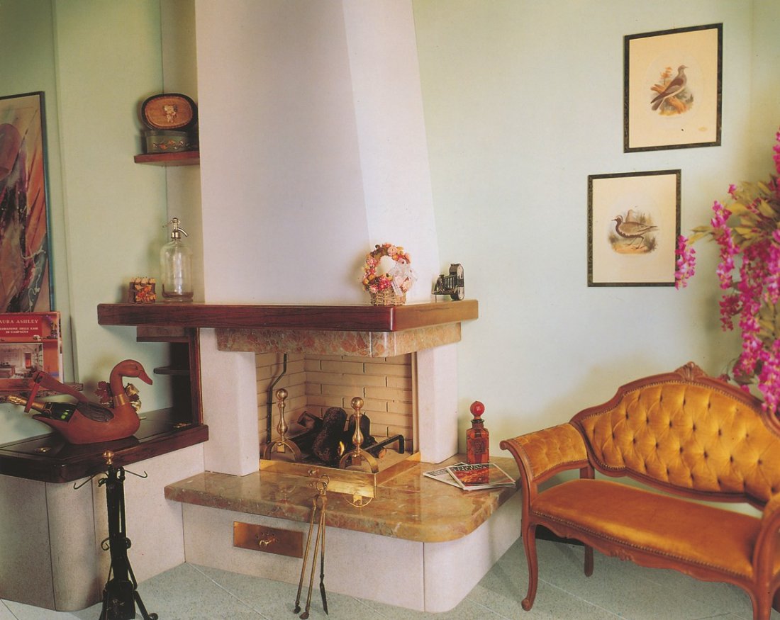 Caminetto con rivestimento realizzato in massetto in trani bocciardato; mensole piano fuoco ed architrave in rosso marocco; cassapanca portalegna, mobiletto porta oggetti e travi in massello di legno tinta color noce.