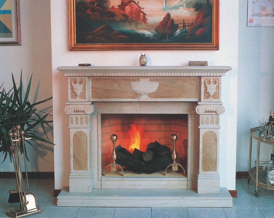 Caminetto con rivestimento stile Robert Adam, del settecento inglese, realizzato in massetto di pietra dorata, levigata e scarpellata, con capitelli ionici e decorazioni etrusche.