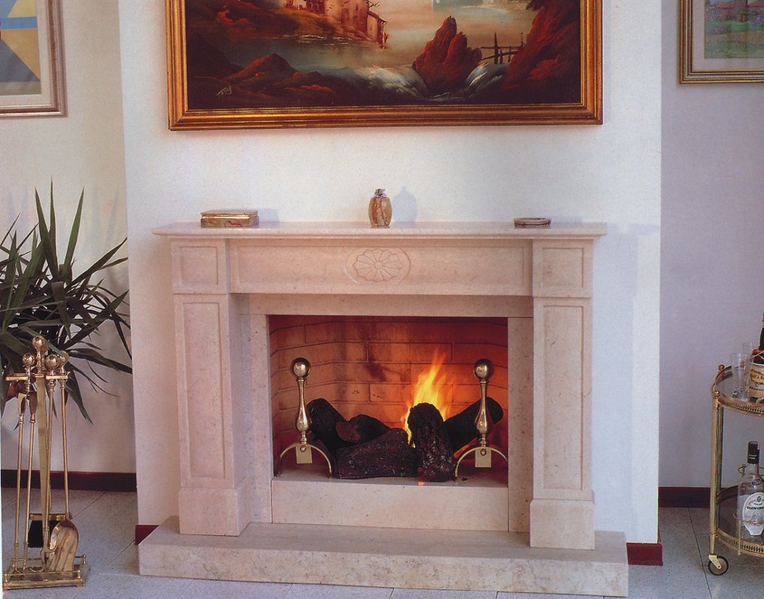 Caminetto con rivestimento in stile Luigi XVI realizzato in massetto di trani scolpito interamente a mano.