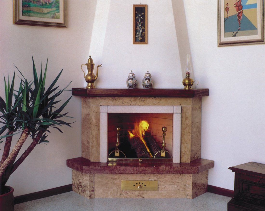 Caminetto con rivestimento realizzato in massetto di trani bocciardato; mensole piano fuoco in rosso verona; trave e cassetto porta legna in legno massello tinta color noce.È disponibile su misura.Versioni: angolo o parete, piccola o grande, ...