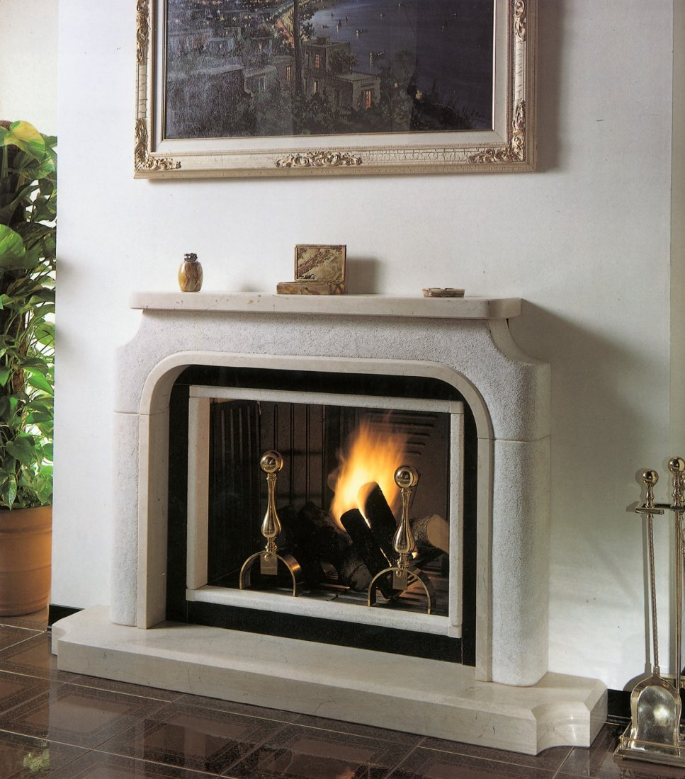Caminetto con rivestimento a cornice realizzato in massetti di travertino bianco anticato a poro aperto. A richiesta può essere realizzato in massetti di peperino anticato, travertino rosato anticato a poro aperto, pietra dorata sabbiata, ...