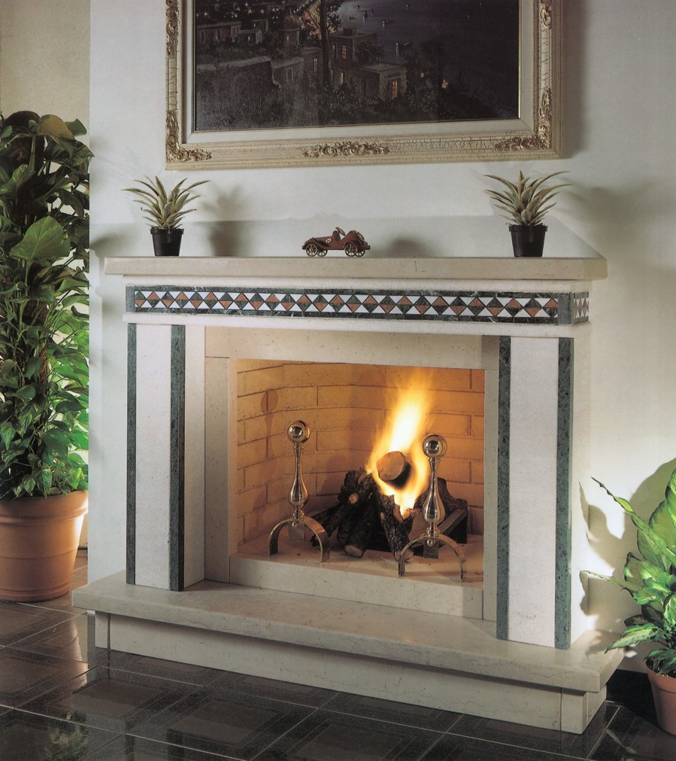 Caminetto con rivestimento realizzato in massetto di trani in parte liscio, in parte bocciardato, con cornice interna di granito nero.A richiesta la cornice interna può essere realizzata anche con altri marmi, pietre e graniti e su ...