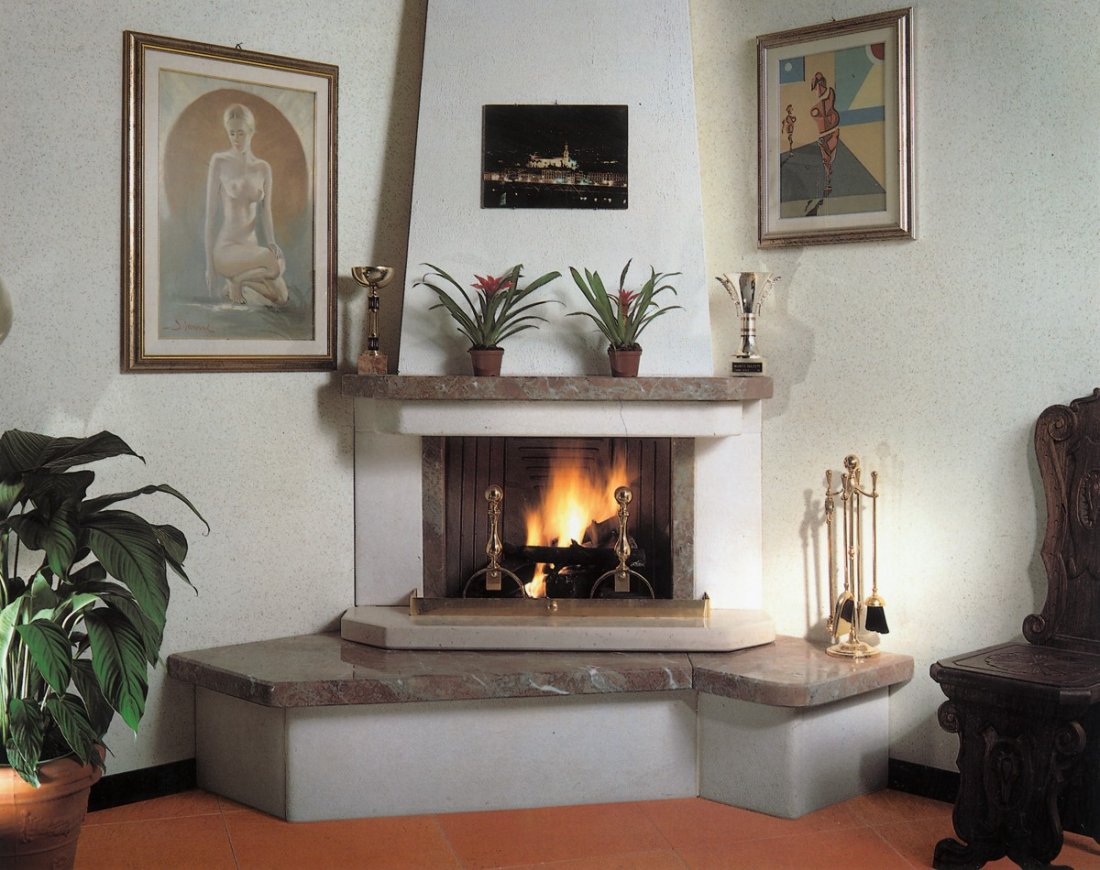 Caminetto con rivestimento realizzato in massetto di trani bocciardato, mensola piano fuoco rialzata ed architrave in trani lucido; rifiniture montanti, sotto mensola piano fuoco e mensola superiore in rosso marocco liscio. A richiesta può essere fornito su misure del cliente e con materiali di finitura diversi.