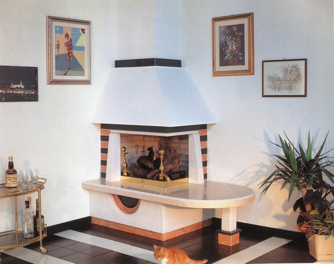 Caminetto angolare realizzato in pietra di Trani striata, con zoccoletto in granito Nero D'Africa. Le mensole sono in pietra di Trani lucidata. Apertura laterale destra o sinistra. Disponibile per la serie DS70, DS90 e DS100 sia ghisa che ...