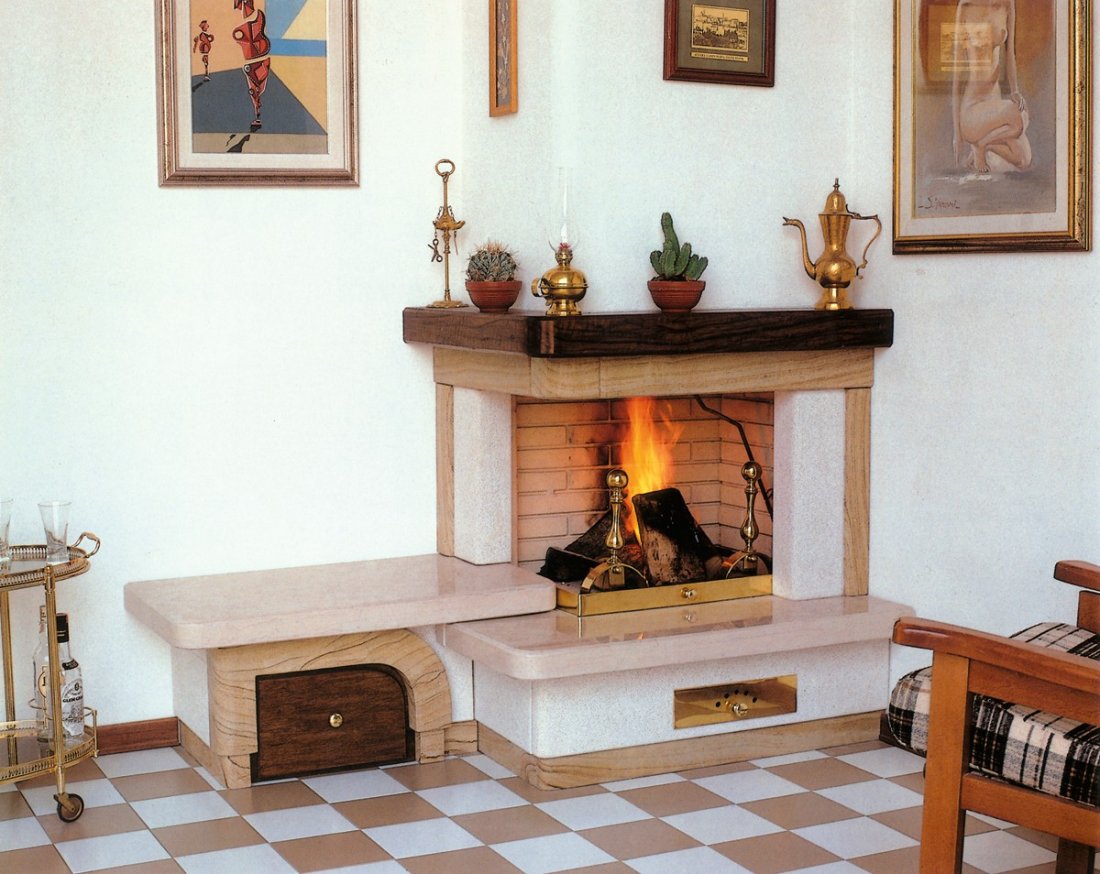 Caminetto con rivestimento realizzato in massetto di trani bocciardato rifinito in pietra dorata lucidata; mensole piano fuoco in trani lucido; trave e cassetto in legno massello tinta color noce.