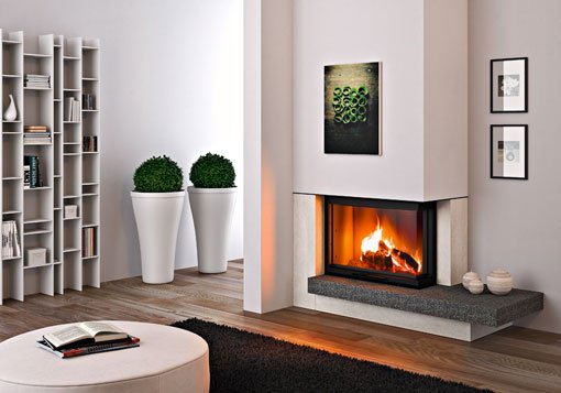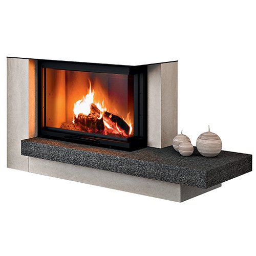 Rivestimento per camino ad angolo realizzato in marmo Nero Africa fiammato e spazzolato (piano fuoco), Pietra Senape spazzolata (alzata, spalle) e acciaio verniciato nero (supporto, cappa). Disponibile nelle versioni angolo sx/angolo dx. E' possibile averlo anche con materiali diversi e su misura.