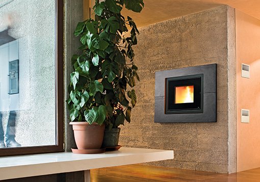 Rivestimento per camino a pellet costituito da una cornice in pietra Ardesia a spacco naturale. E’ abbinabile ai camini, Vivo 70 Wood, Vivo 90 Wood.