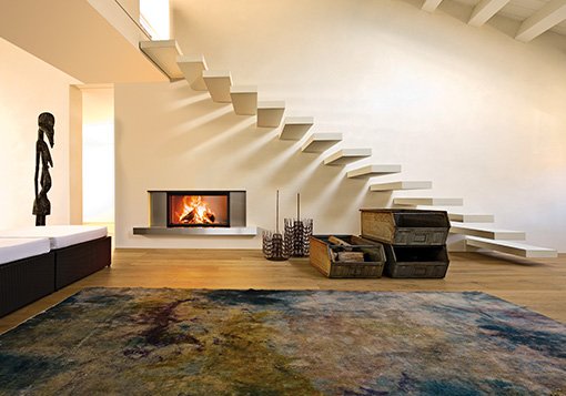 Rivestimento per camino ad angolo realizzato in pietra Kanfanaro levigata e acciaio verniciato nero. E' possibile averlo anche con materiali diversi e su misura.