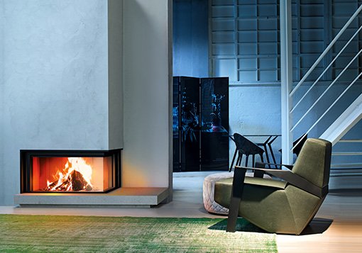 Rivestimento per camino ad angolo realizzato in pietra Kanfanaro levigata e acciaio verniciato nero.