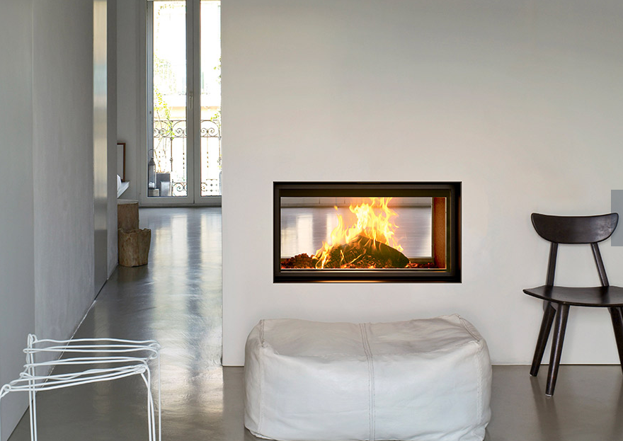 Camino bifacciale a legna dalle caratteristiche innovative, performante, facile da usare, con camera di combustione stagna.