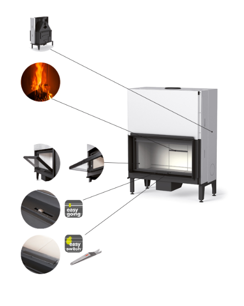 Il sistema di regolazione “Easy Going” è stato progettato pensando all’utilizzatore: non più concetti tecnici legati alle fasi della combustione, ma una semplice scelta tra 5 opzioni corrispondenti a reali situazioni d’uso del camino: