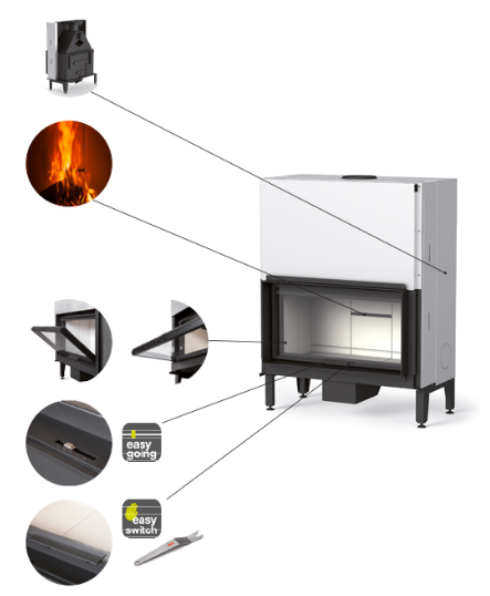 Il sistema di regolazione “Easy Going” è stato progettato pensando all’utilizzatore: non più concetti tecnici legati alle fasi della combustione, ma una semplice scelta tra 5 opzioni corrispondenti a reali situazioni d’uso del camino: