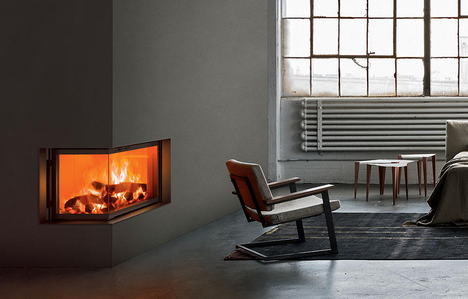 Camino angolare a legna dalle caratteristiche innovative, performante, facile da usare, con camera di combustione stagna.
