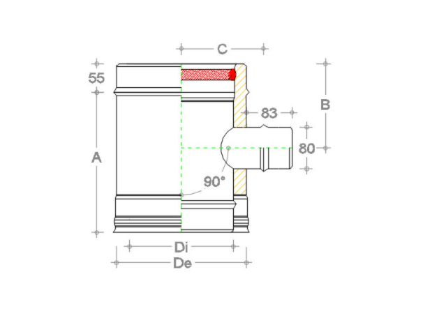La "T" 135° o Braga a parete doppia,rappresenta il componente fondamentale per raccordare,con angoli a 45° tratti orizzontali,con la verticale di un Sistema Camino secondo la UNI EN 1856-1.o di un Canale da Fumo.