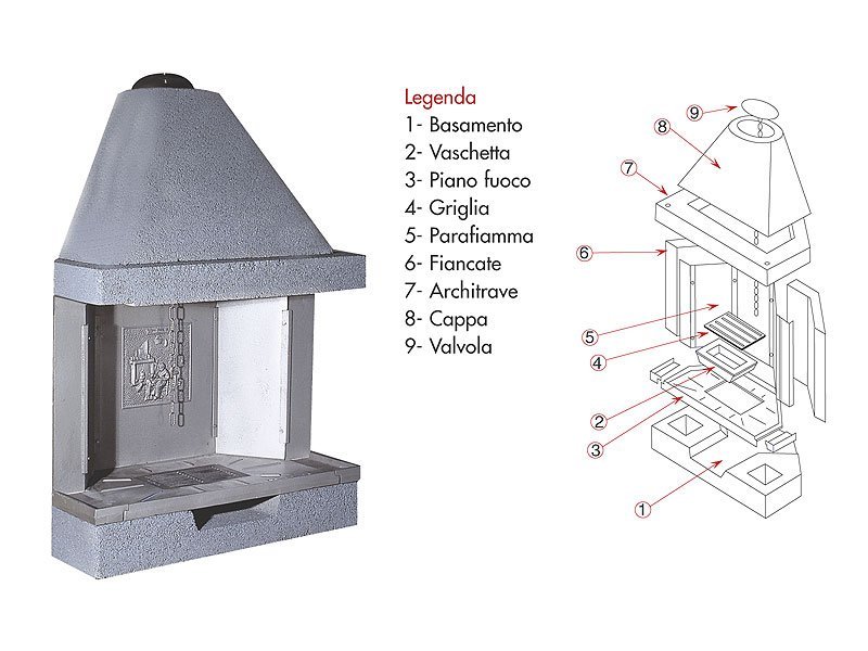 Modello posizionabile sia ad angolo che a parete, con apertura a sinistra. Il piano fuoco ed il parafiamma sono interamente in ghisa da 10 mm. di spessore.
