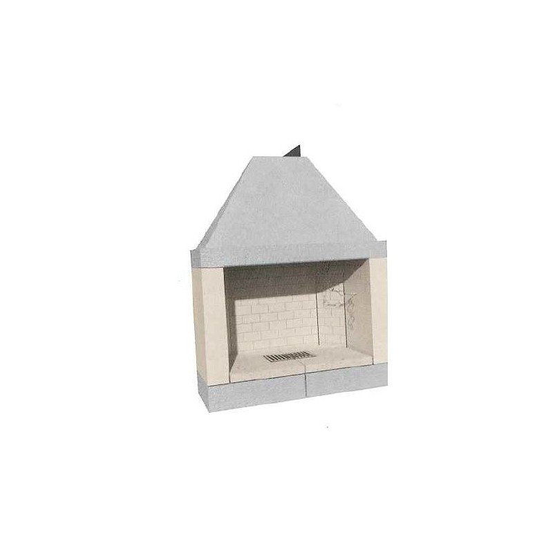 Caminetto prefabbricato a legna a focolare aperto completo di parafiamma in ghida da 16kg, valvola fumi, vaschetta cenere e griglia in ghisa. Struttura realizzata in conglomerato cementizio alleggerito. Focolare realizzato in refrattario ad alto tenore di allumina. Posizionabile sia ad angolo che a parete ideale per la cottura di cibi ed arrosti.