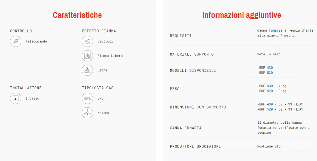 Se vuoi realizzare un camino moderno con fiamma a filo piano fuoco, il bruciatore BRF è la soluzione ottimale. Questo bruciatore infatti va incassato nel piano fuoco, collegato alla rete del gas ed è subito funzionante. E’ disponibile in 2 misure: 430 e 520 mm di larghezza. Per facilitare l’installazione del bruciatore, consigliamo di abbinare anche il supporto per incasso che ne aumenta l’ingombro ma ne facilità l’installazione. In dotazione telecomando radio e legna in ceramica.